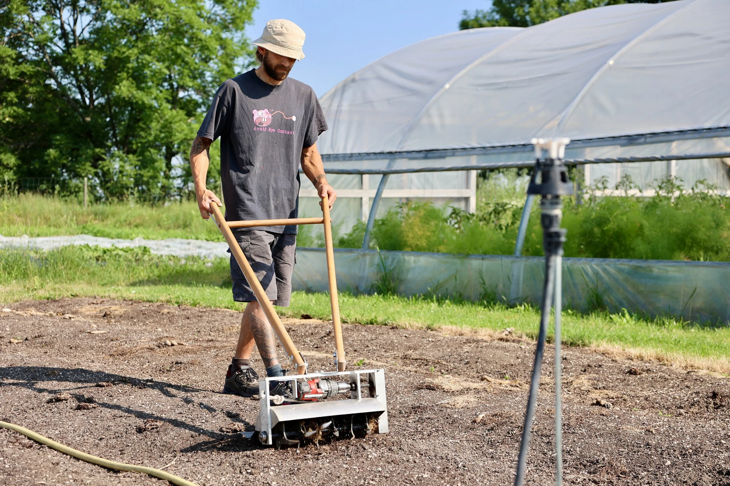 Der Tilther: Die mit Akku-Schrauber betriebene Mini-Fräse funktioniert wie ein elektrischer Rechen, der lediglich die obersten 2-3 cm des Bodens bewegt. Deshalb kommt das Gerät teilweise auch im No Dig Anbau zur Anwendung, weil damit nur die Kompostschicht und nicht der eigentliche Mutterboden bearbeitet wird. (Foto: Johannes Pelleter)